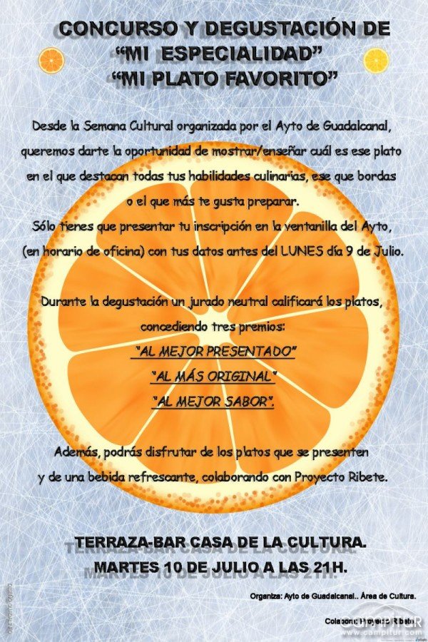 21:00 h.- Concurso y degustación de “Mi especialidad. Mi plato favorito”. Los interesados en participar pueden apuntarse en el Ayuntamiento. Entrega de premios. Colaboran y participan: Proyecto Ribete de Guadalcanal. Entrada libre. Lugar: Terraza Bar de la Casa de la Cultura.